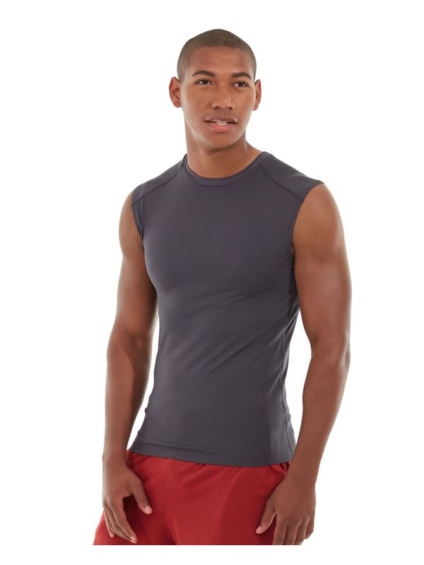 • Dark gray polyester spandex tank.