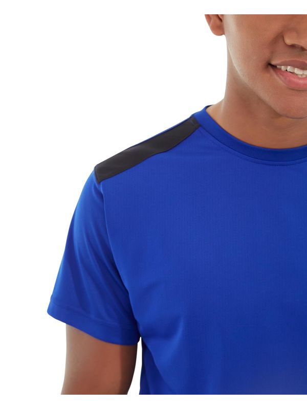• Royal polyester tee with black accents.