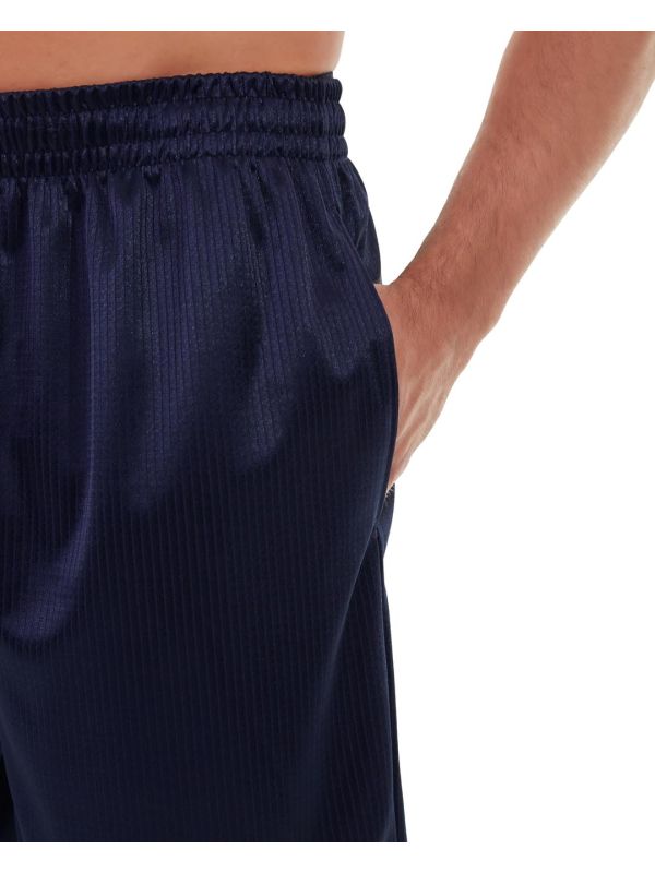 • Navy polyester pinstripe shorts.